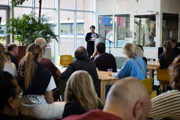 Nadat de confetti en onthulling van de webshop plaats hadden gevonden, ging het woord over naar Linda Tammerijn van Zuivere Koffie, en Rogier ter Hall van De Forensische Zorgspecialisten. Het idee om de koffiebranderij te starten ontstond in 2020 bij Ter Hall nadat hij een artikel over Zuivere Koffie las. Tammerijn en Ter Hall vertelden over hoe de samenwerking daarna ontstaan is, en welke gemeenschappelijke doelen de organisaties nastreven. Extra aandacht ging uit naar alle partners die hebben bijgedragen aan de ontwikkeling van de koffiebranderij en The Bean Specialists als merk.